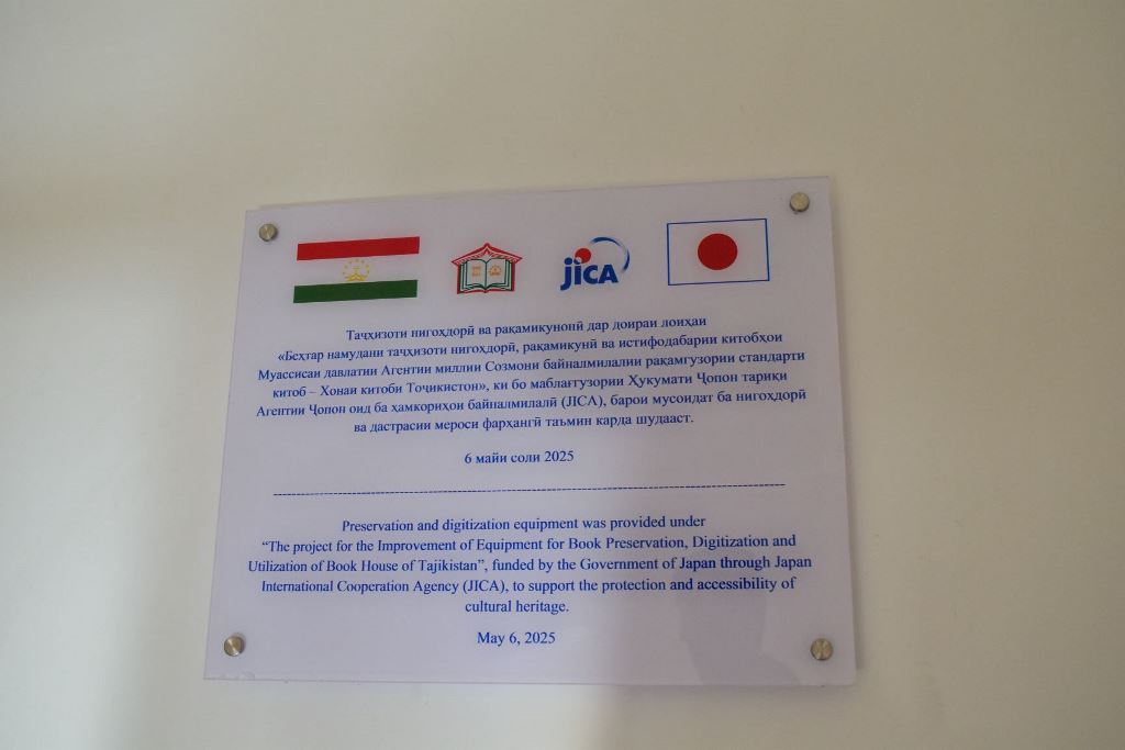 6 мая Чрезвычайный и Полномочный посол Японии в Таджикистане Кэйко Фурута и министр культуры страны Матлубахон Сатториён приняли участие в церемонии передачи оборудования в рамках «Проекта по улучшению оборудования для сохранения, цифровизации и использования Книжного дома Таджикистана». Проект реализуется Японским агентством международного сотрудничества (JICA) и поддерживается в рамках схемы безвозмездной помощи правительства Японии. На проекта выделили 83,8 млн японских иен (примерно $600 000).
