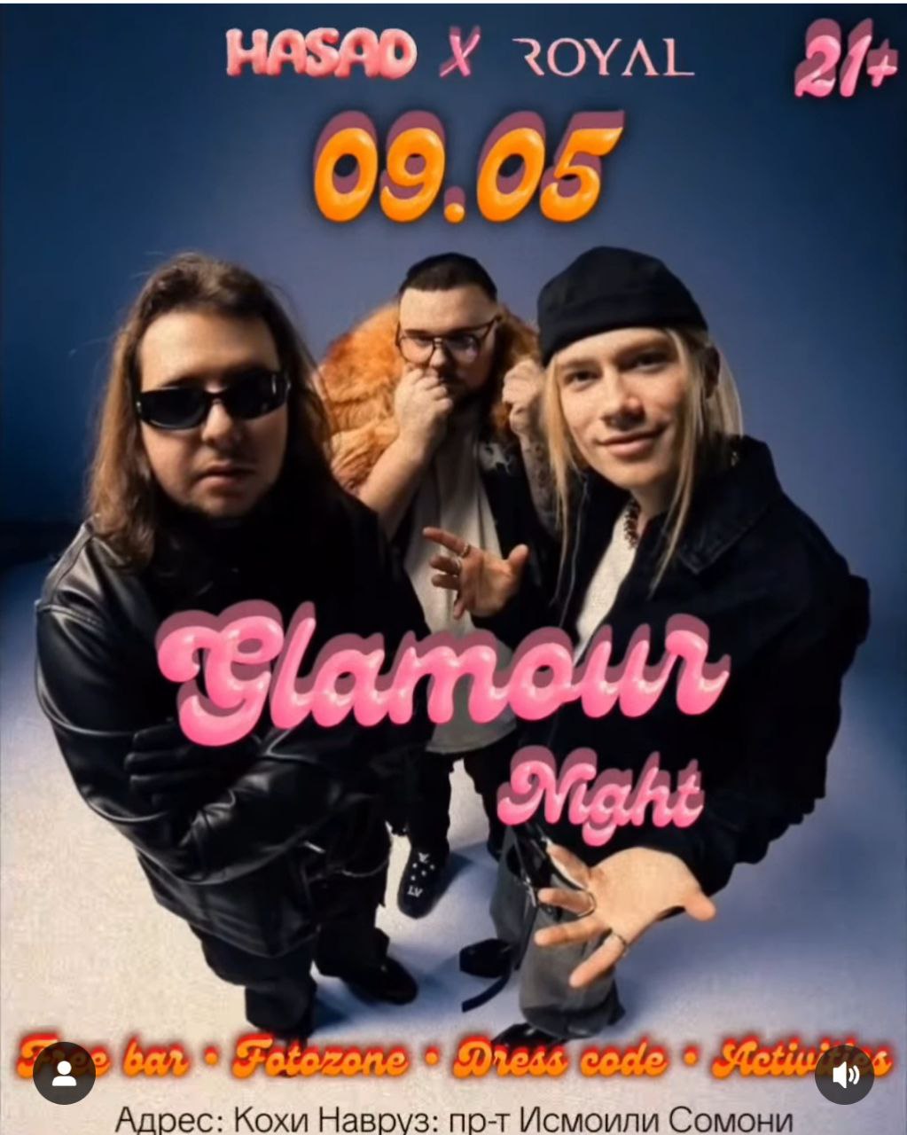 @Hasad приглашает всех желающих на самую гламурную ночь весны Glamour 2007 party, которая стартует 9 мая в 23:00 в Royal club. Вас ждёт ночь блеска, глянца и ностальгии по 2000-м. Здесь будут топовые диджеи Душанбе, бесплатные коктейли и 20%-я скидка на меню и бар! Также в программе: конкурсы с тематическими призами, фото-зона 2007 и секретный гость.