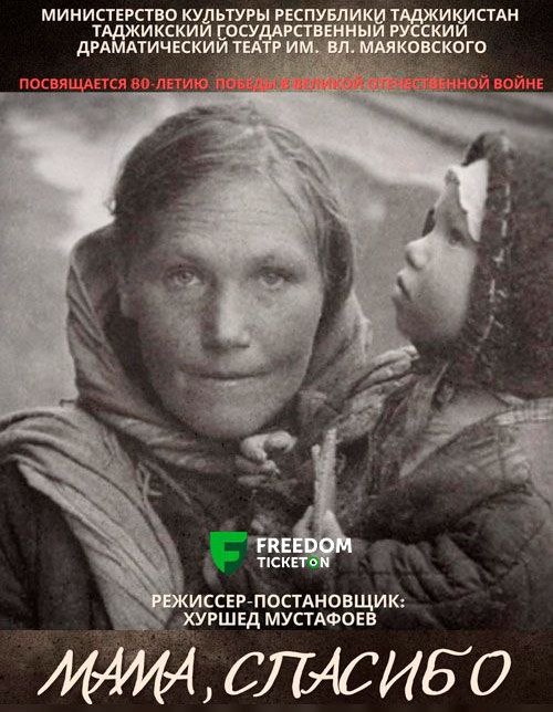 В Государственном русском драматическом театре им. В. Маяковского 10 мая в 16:00 состоится показ спектакля «Мама, спасибо за жизнь» Хуршеда Мустафоева, посвященный Великой Отечественной войне. Сюжет разворачивается в период эвакуации в эшелоне, увозящем людей и станки на восток – подальше от линии фронта. В тесном вагоне-теплушке ютятся несколько женщин разного происхождения и привычек, которым приходится делить тепло одной печки, сообща присматривать за детьми, добывать пропитание и ухаживать за больными. А затем…