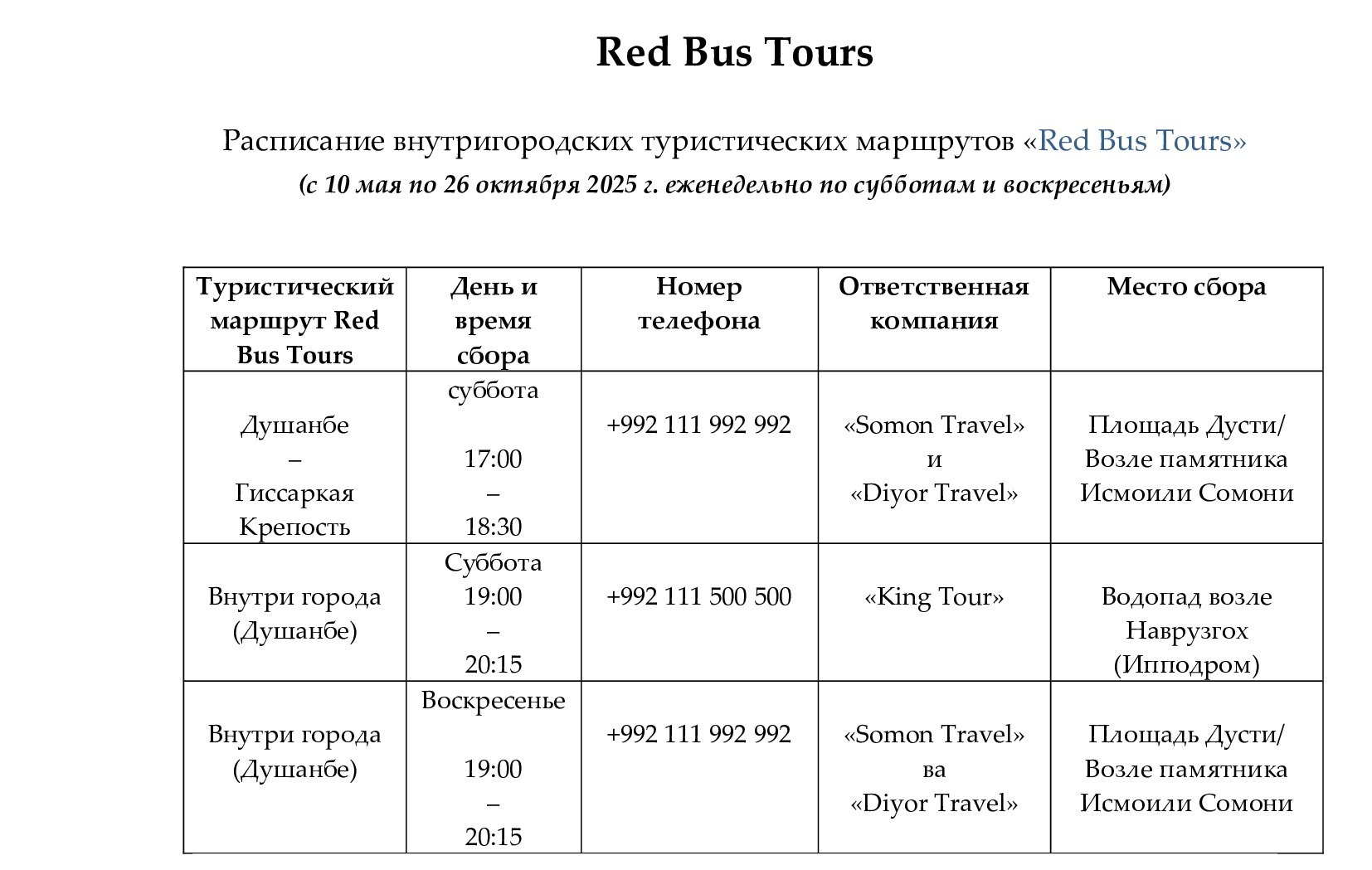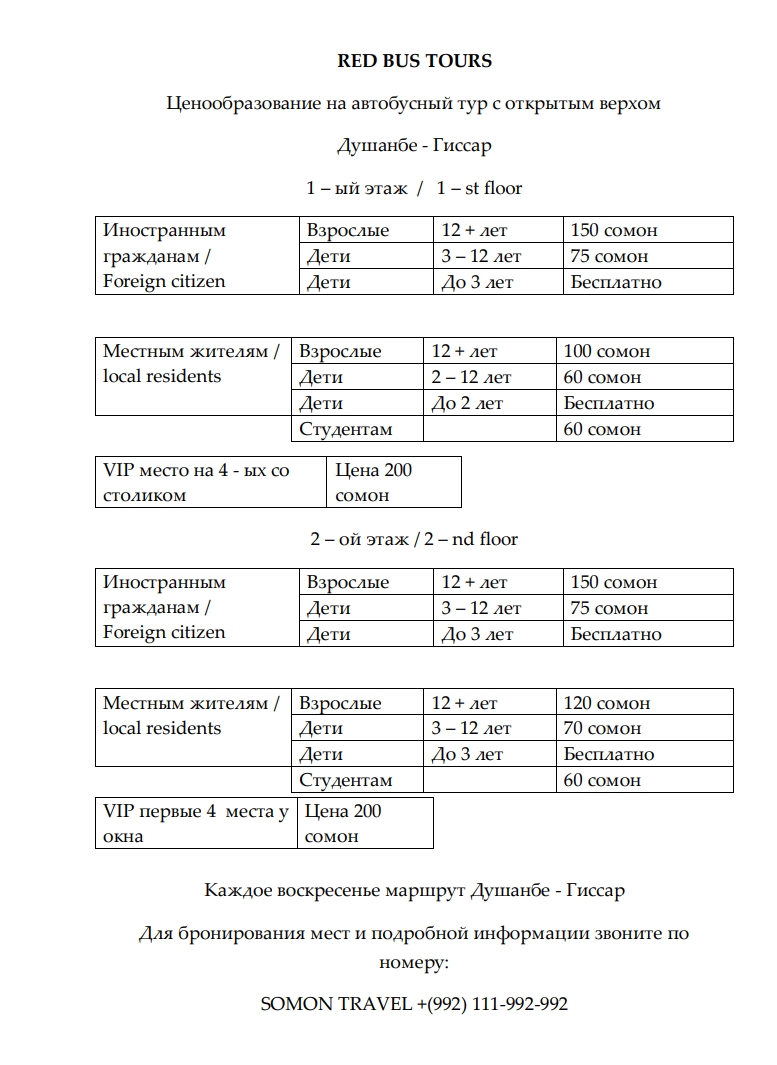 В рамках внутригородских маршрутов также еженедельно по субботам будет задействован маршрут Душанбе-Гиссар. К реализации туров привлечены компании King Tour, Somon Travel и Diyor Travel.