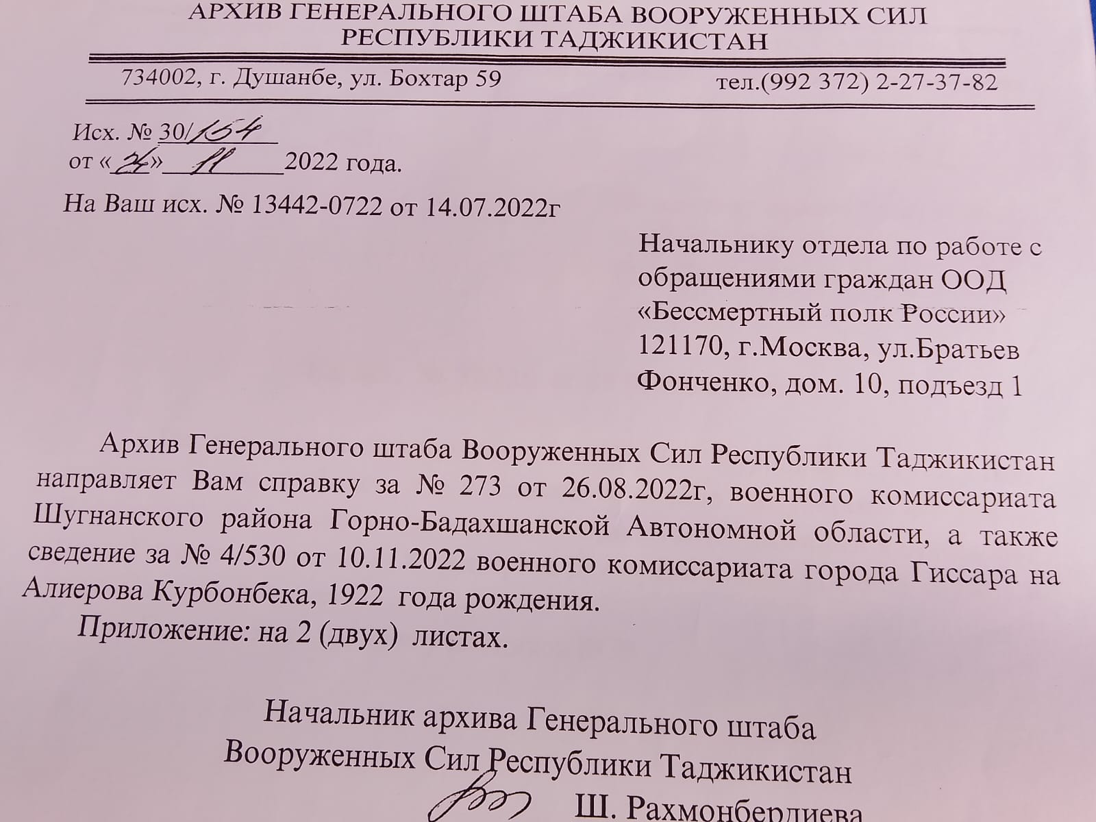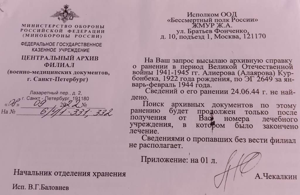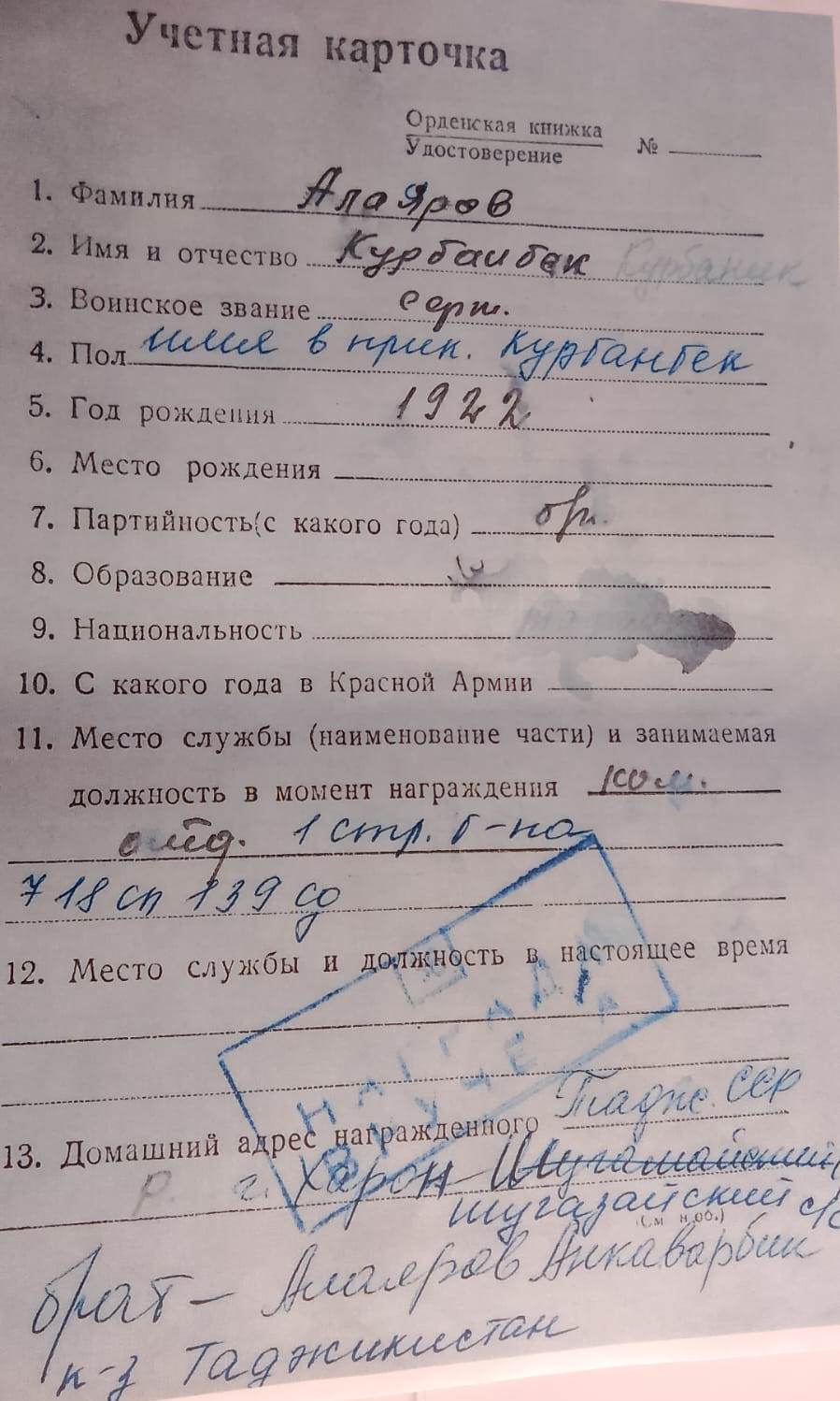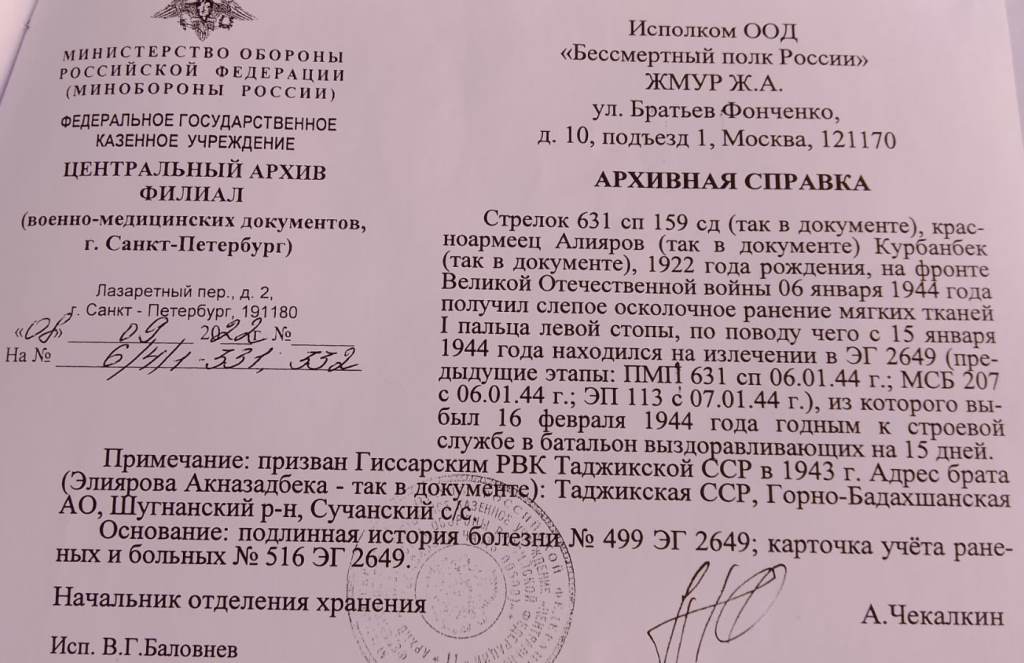В архивных документах фамилия Курбонбека (Курбоник) написана по-разному, имеются опечатки, местами он указан как Алиеров, Алияров, Алаяров и Аллияров, но во всех картотеках и анкетах в графах «Место жительства», «Место призыва» и «Близкие родственники» указана абсолютно одинаковая информация. Благодаря чему мы точно узнали, что речь идет об одном и том же человеке.