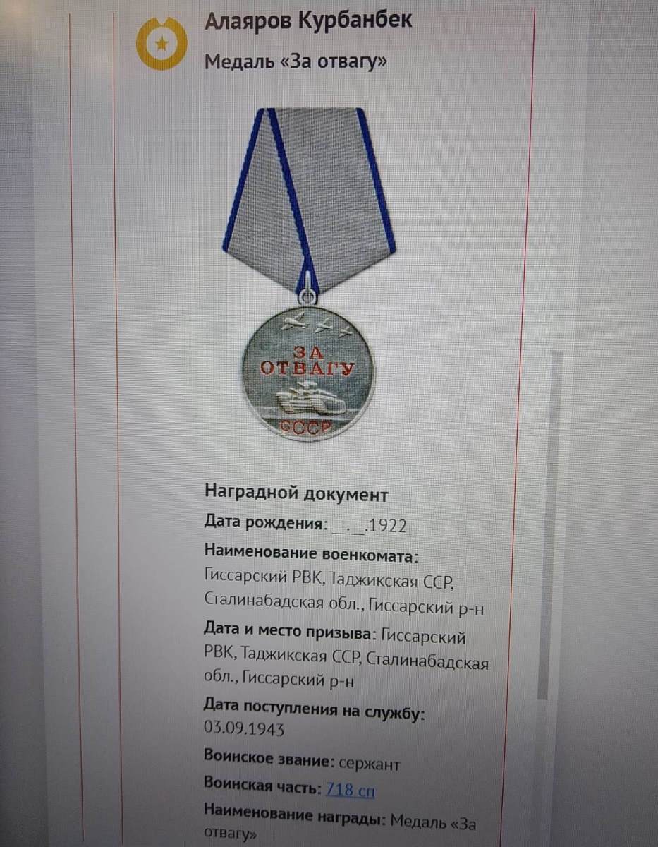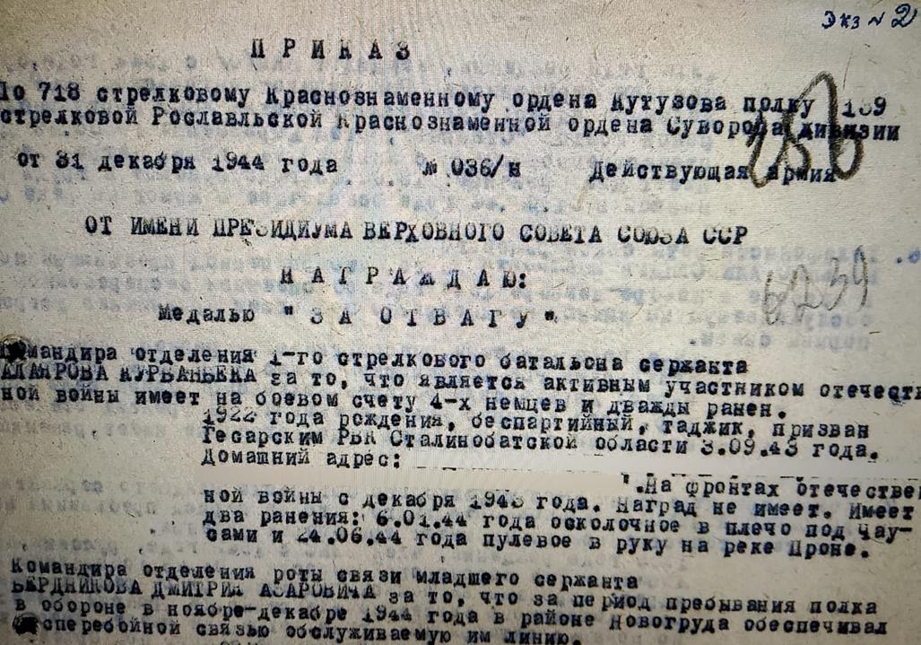 В конце 1944 года, точнее 31 декабря, приказом № 36/н командир отделения 1-го стрелкового батальона сержант Курбонбек Алияров за активное участие в Отечественной войне, имевший на боевом счету 4-х немцев, а также дважды раненый был награжден медалью «За Отвагу».