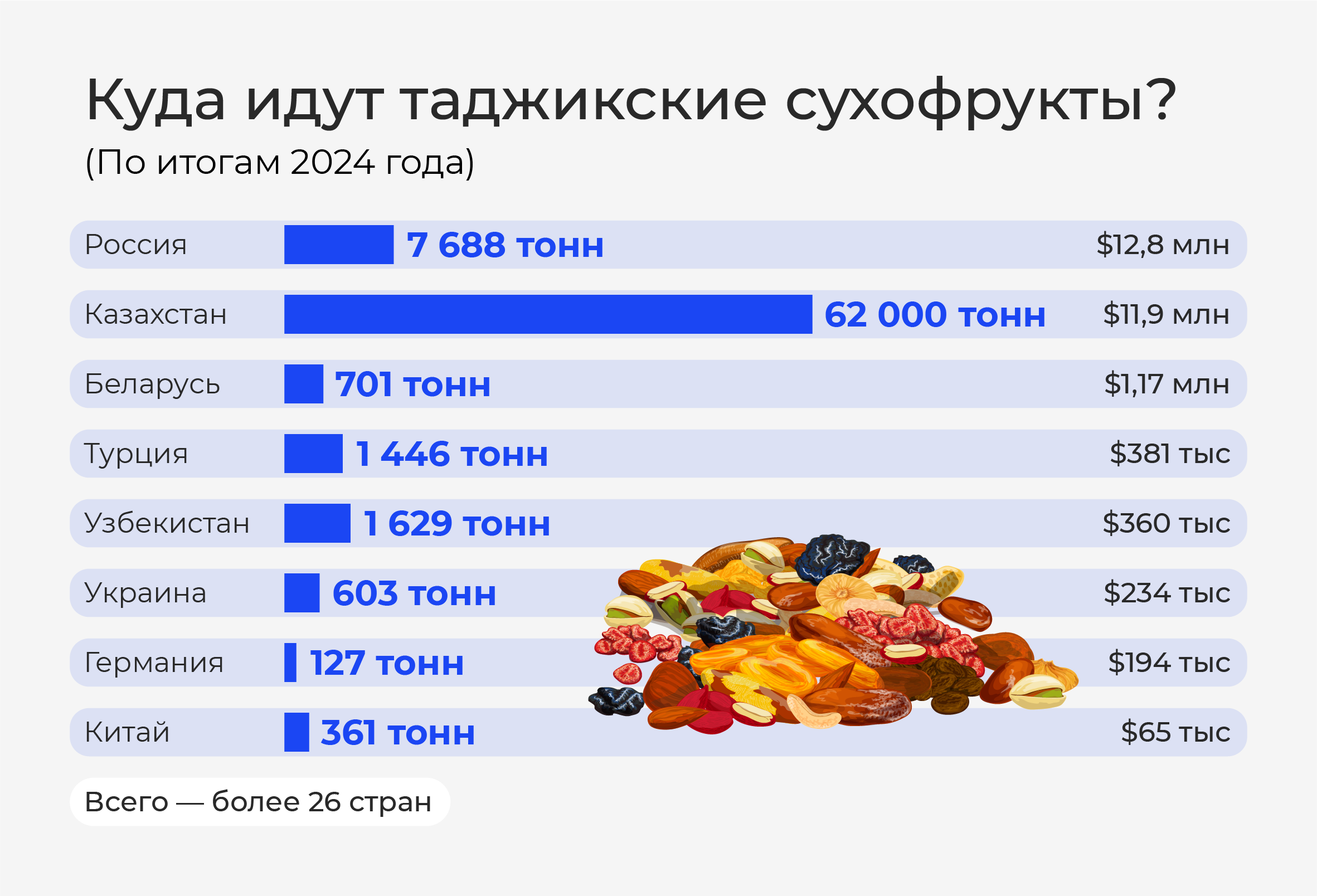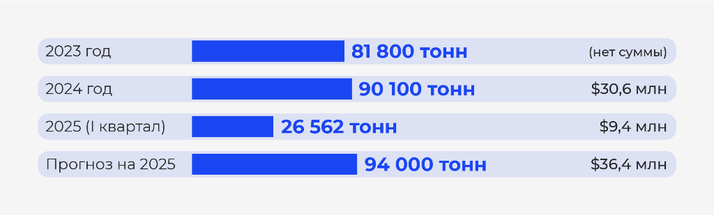 В 2023 году было экспортировано 81,8 тыс. тонн сухофруктов, в 2024 году — уже 90,1 тыс. тонн. Основными рынками сбыта остаются страны СНГ, Германия, Китай и Турция.