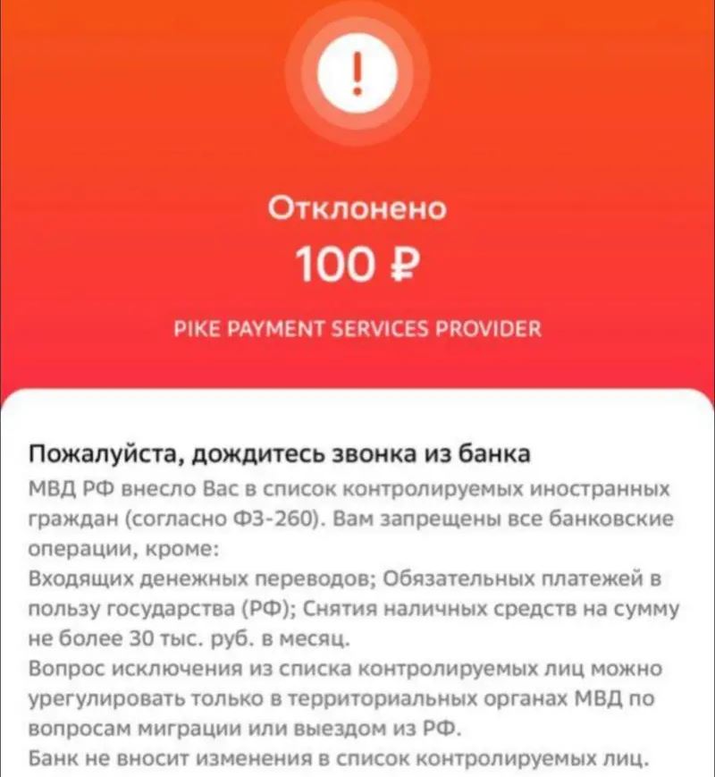 Ниже пояснение: «МВД РФ внесло Вас в список контролируемых иностранных граждан. Вам запрещены все банковские операции, кроме: входящих денежных переводов; обязательных платежей в пользу государства (РФ); снятия наличных средств на сумму не более 30 тысяч рублей в месяц».