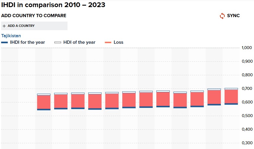 Индекс человеческого развития с поправкой на неравенство в Таджикистане показывает потери: 14,04%, что снижает значение индекса человеческого развития до 0,594 в 2023 году. При этом, чем выше уровень неравенства в стране, тем больше потери в человеческом развитии.