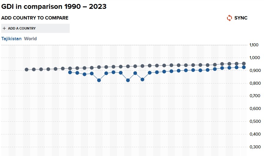 Значение женского ИЧР 2023 года для Таджикистана составляет 0,662 по сравнению с 0,715 для мужчин, в результате чего значение составляет 0,926, помещая его в группу 3.
