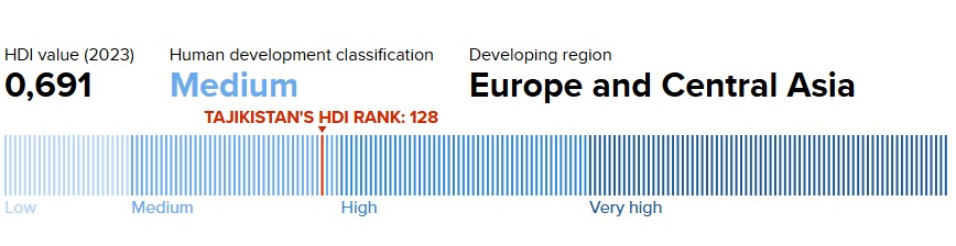В период с 1993 по 2023 год ожидаемая продолжительность жизни в Таджикистане при рождении изменилась на 16,28 года, ожидаемая продолжительность обучения изменилась на 0,03 года, а средняя продолжительность обучения изменилась на 1,39 года. ВНД на душу населения Таджикистана изменился примерно на 136,9% в период с 1993 по 2023 год», — пишут авторы.
