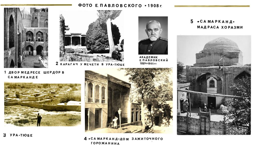 В одном из фотоархивов нам удалось обнаружить несколько очень профессиональных фотографий архитектуры Ура-Тюбе и Самарканда, снятые в 1908 выдающимся ученым Евгением Павловским, академиком, создателем советской школы паразитологии.