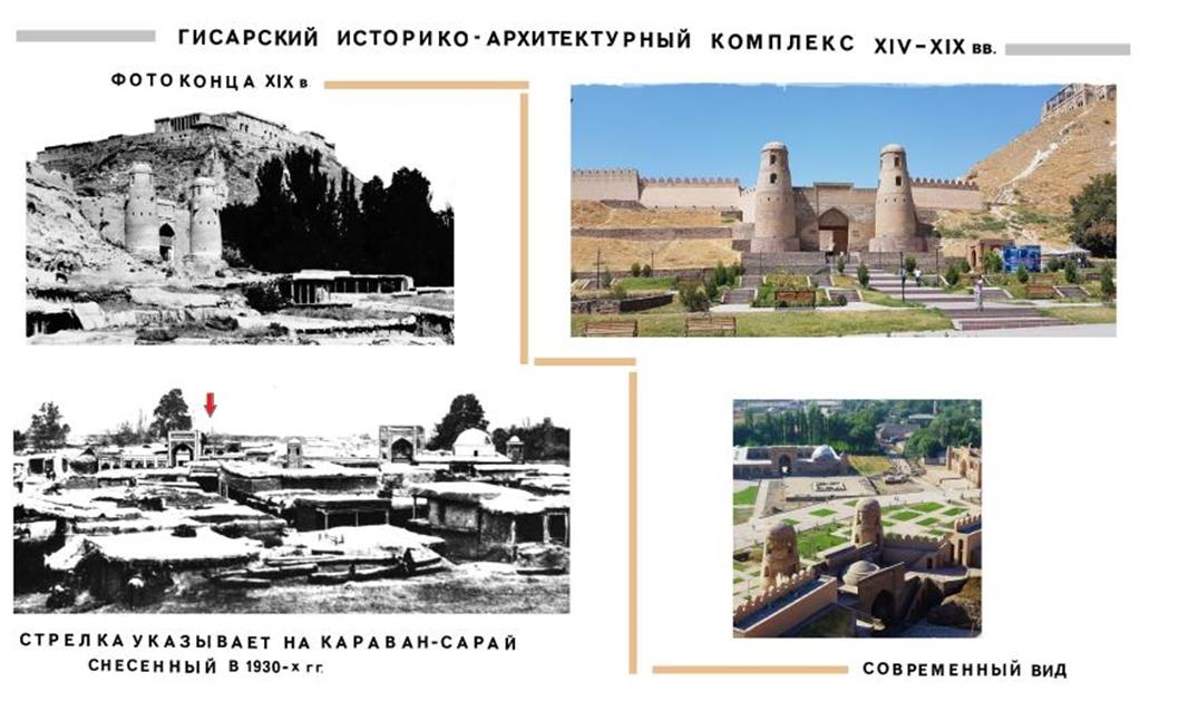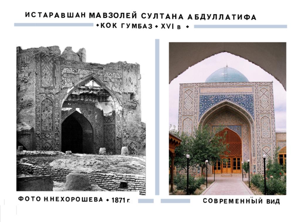 Мы видим, в каком плачевном состоянии пребывало главное здания города — мавзолей-медресе Султана Абдуллатифа (Кок Гумбаз, XVI в) и сравниваем его с отреставрированным в наше время зданием.
