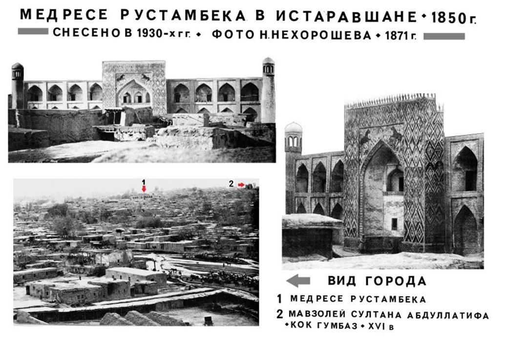 Ура-Тюбе, ныне Истаравшан, очень детально изображён на фотографиях Н.Нехорошева в альбоме «Русский Туркестан». Он показал нам наверно единственную фотографию медресе Рустамбека, построенного в 1850 г. и разобранного на волне борьбы с религией в 1930 годах.