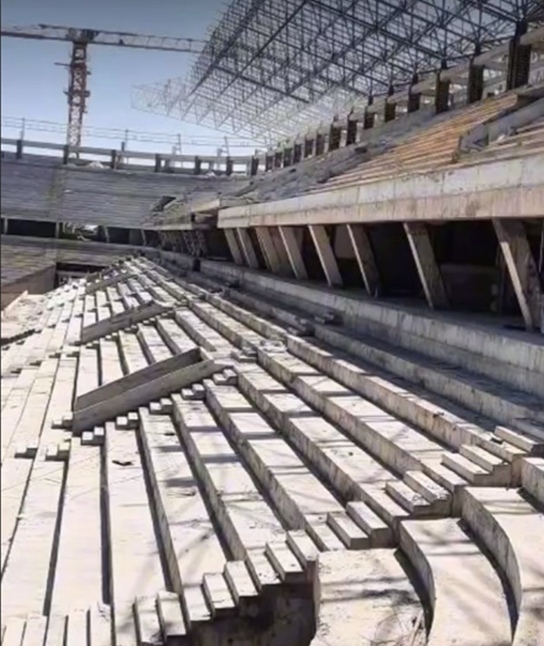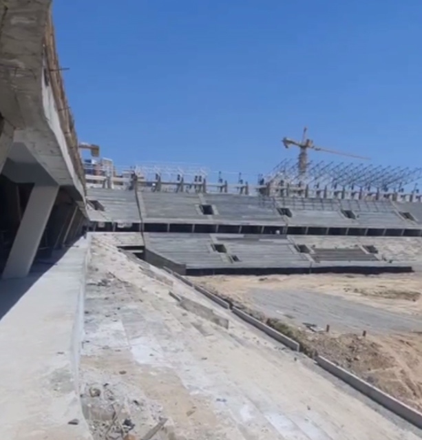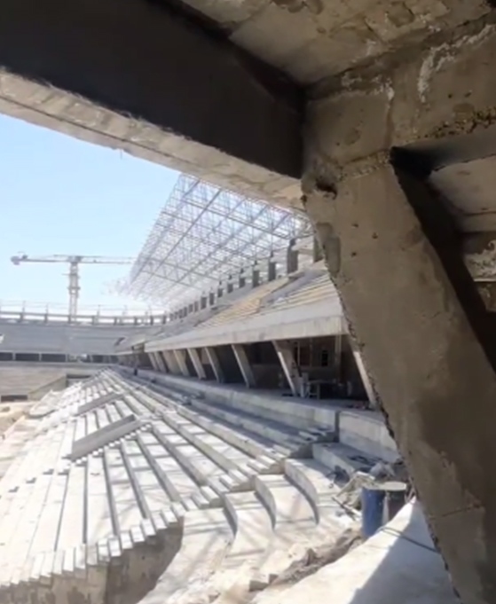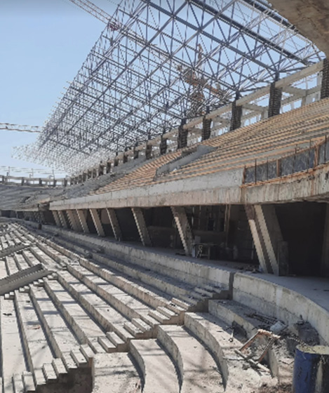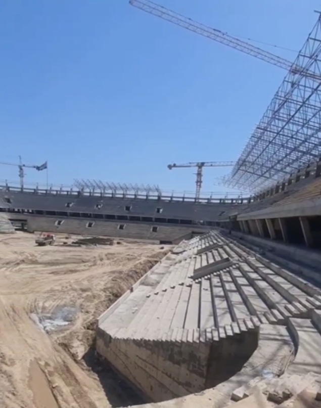 На сегодняшний день завершены основные железобетонные конструкции по всему периметру стадиона. Работы активно продолжаются на западной и северной трибунах, где уже возведены два яруса. В ближайшее время основные силы будут направлены на строительство восточной и южной трибун.