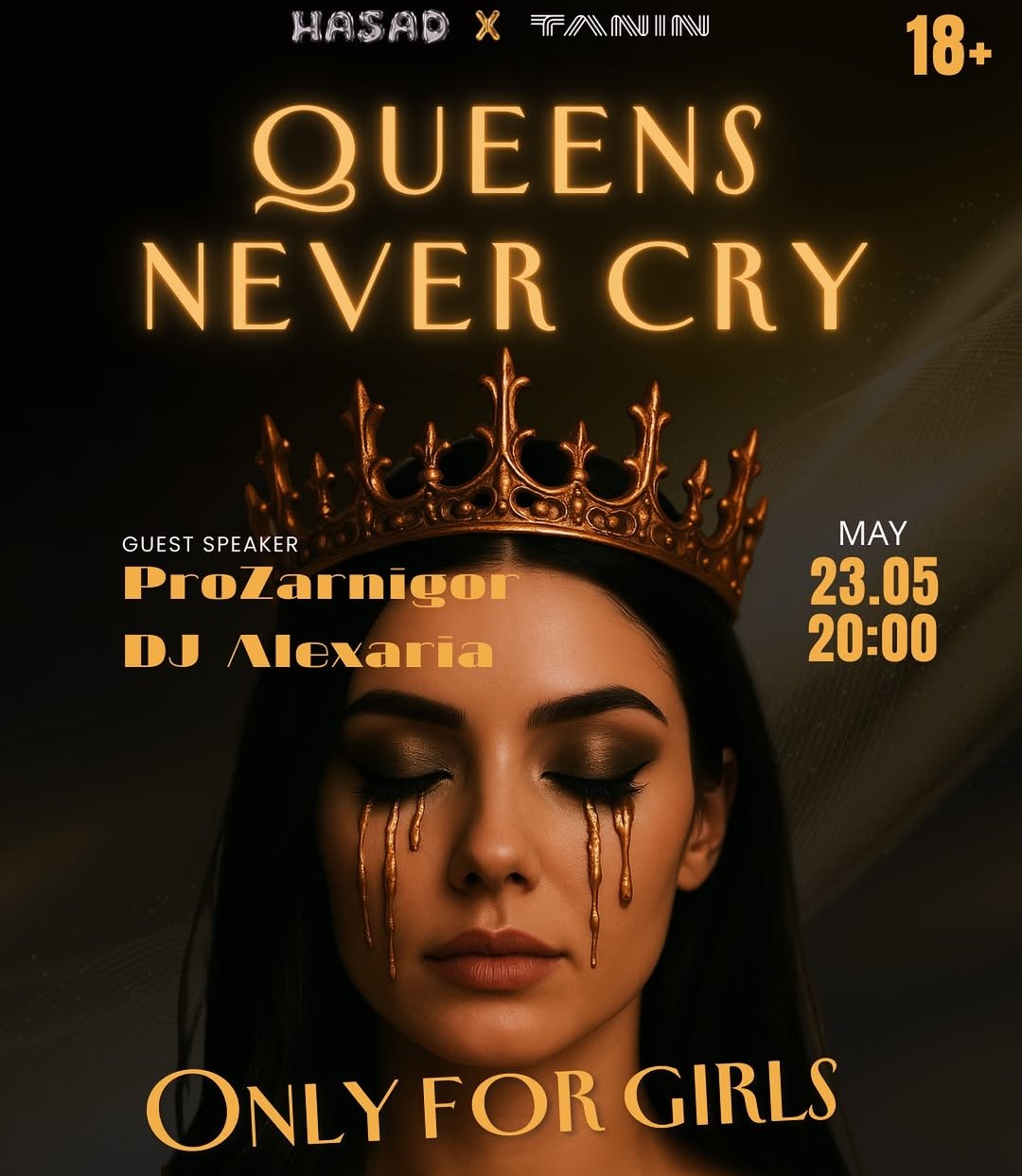 В ресторане «Танин» 23 мая в 20:00 состоится уникальная вечеринка только для девочек Queen Never Cry от Hasad Events. Для каждой участницы она станет местом, где она может плакать, смеяться и быть собой. Психолог Зарнигор расскажет всё о слезах, эмоциях и внутренней силе, а Dj Alexandria обеспечит классную музыкальную программу. Также в программе – караоке, ведь ничто так не помогает избавиться от негативных эмоций, как пение песен.