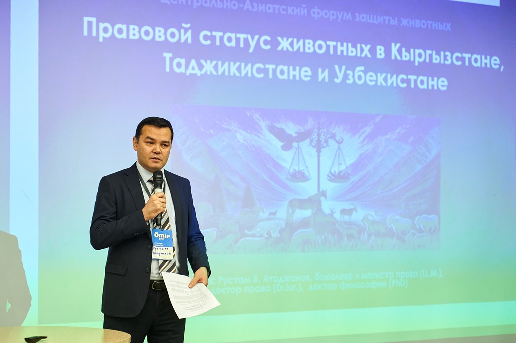 Одним из спикеров форума стал Рустам Атаджанов, ассоциированный профессор и заместитель декана Школы права KIMEP. В своем выступлении он подробно рассмотрел правовой статус животных в четырех странах Центральной Азии, отметив и достижения, и серьезные пробелы в законодательстве и практике.