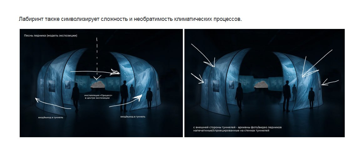 «Каждый зритель сам выбирает маршрут: от глобального — к личному или наоборот. Это визуальное, звуковое и тактильное путешествие, в котором исчезновение ледников воспринимается как потеря общего прошлого», — отмечают организаторы.