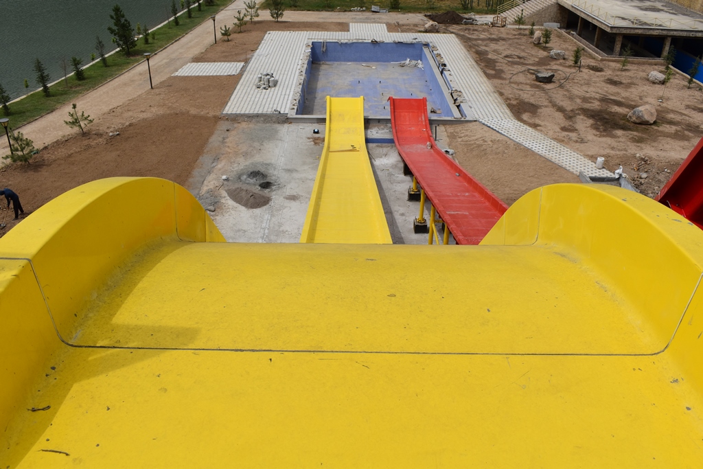 Рядом построены две открытые горки по типу «свободное падение». Длина у них почти одинаковая – 40 метров. Точка старта желтой горки – 11,5 метров в высоту, красной – 13 метров 30 сантиметров.