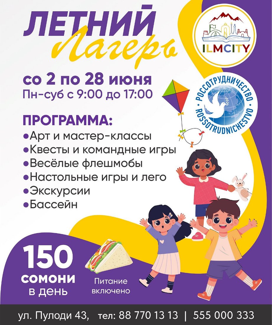 Частная школа «Паёми Дониш» запускает летний лагерь в районе Сино для детей от 4 до 14 лет на смену с 9 июня по 4 июля. Программа включает занятия английским языком, каратэ, гимнастикой, танцами, футболом, баскетболом, творчеством и мастер-классами.