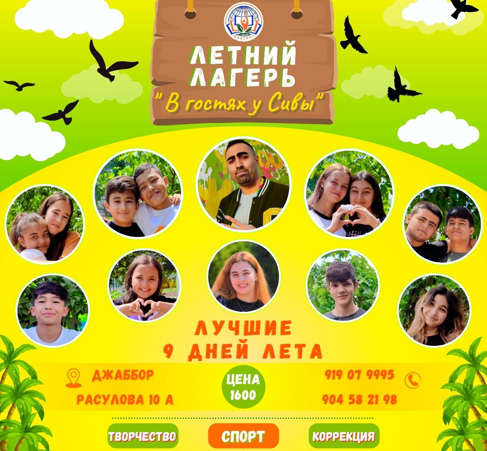 Летний лагерь Сивы Джалилова предлагает 9 дней активного отдыха и развития для детей от 6 до 16 лет. Программа включает ежедневные творческие и развлекательные мероприятия, два визита в аквапарк «Дельфин», спортивные игры на футбольных, волейбольных и баскетбольных площадках, купание в бассейне и досуг в игровых зонах с Playstation, теннисом и бильярдом.