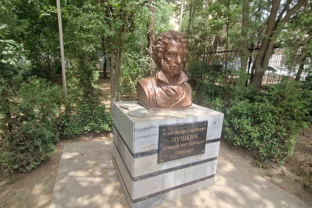 На территории школы расположен бюст великому русскому поэту Александру Пушкину, в честь которого и названа школа. Как отметила Инна Сафронова, это самый большой бюст поэту в республике, и его сохранение взято под контроль Министерства культуры страны по личному поручению министра Матлубахон Сатториён. Это «Азии-Плюс» подтвердили в самом ведомстве.