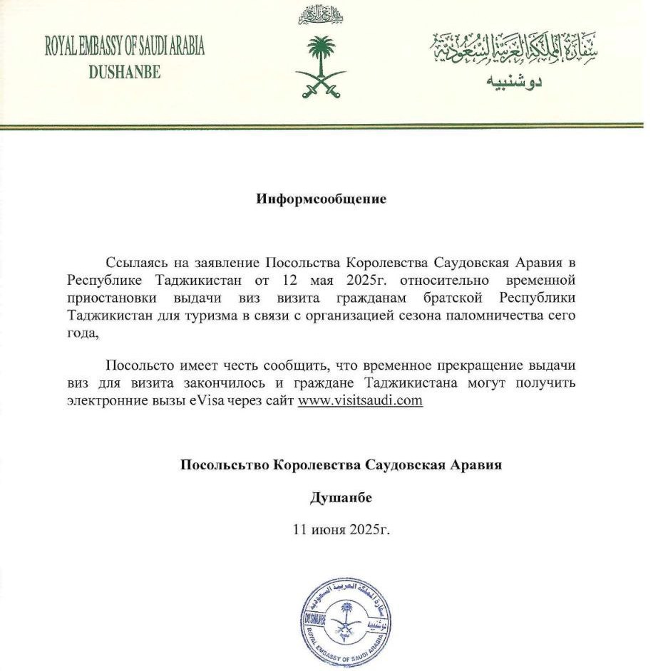 С 12 июня года Саудовская Аравия возобновляет выдачу электронных туристических виз (eVisa) для граждан Таджикистана. Об этом «Азия-Плюс» сообщили в посольстве Саудовской Аравии.