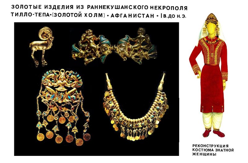 Образцами искусства ранне-кушанского периода служат золотые изделия, обнаруженные археологом В. Сарианиди на севере Афганистана на холме Тилло-тепа-Золотой холм, подтверждая существование местной бактрийской высокохудожественной школы обработки металлов в сако-скифском стиле, с еще заметными эллинскими элементами.