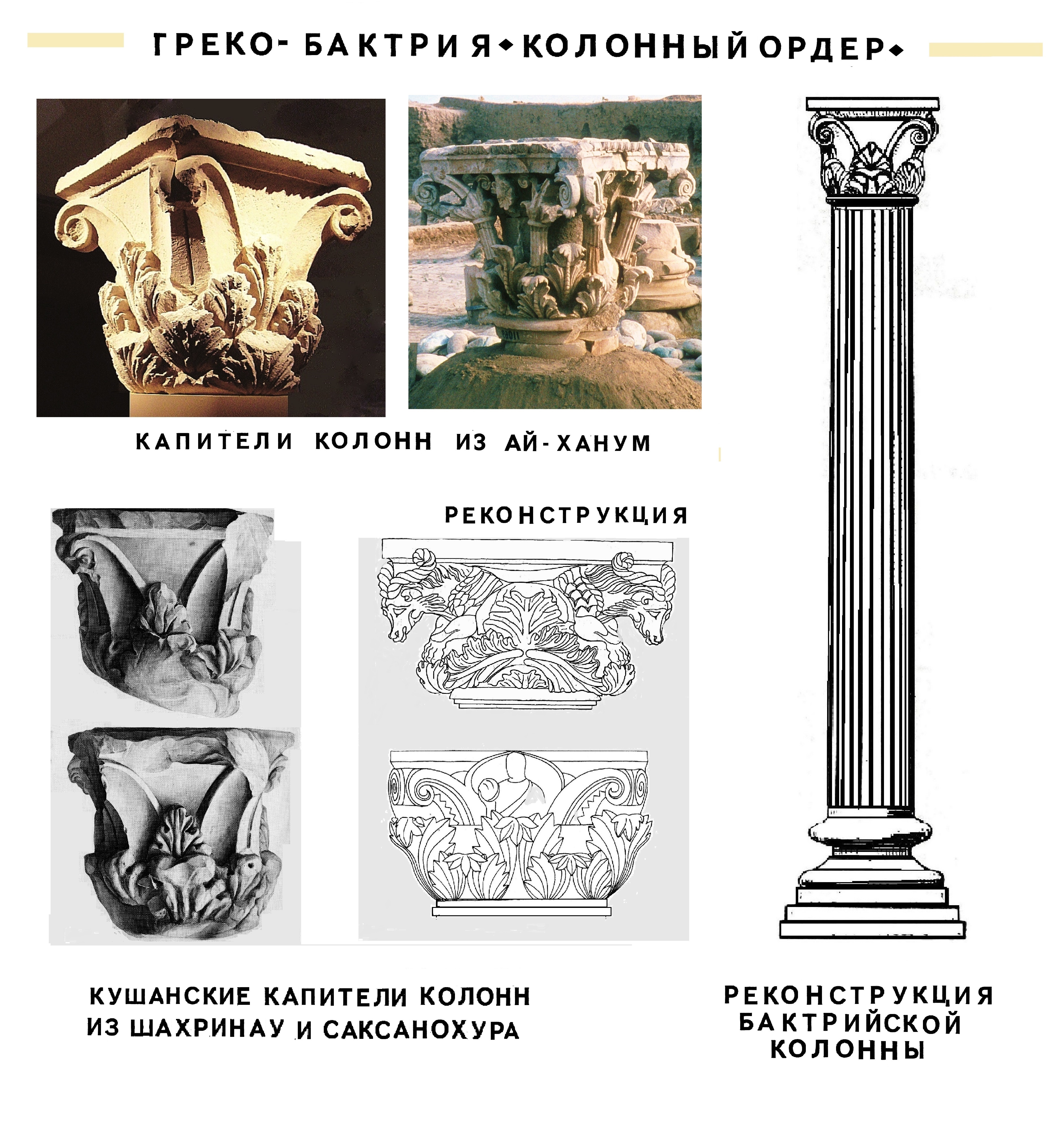 Колонны в Ай-Хануме опирались на торовидные, ахеменидского типа базы и завершались в верху изящными греческими коринфскими капителями.
