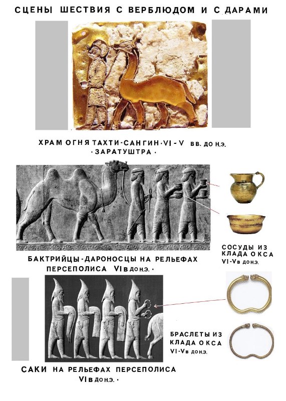 Кстати, там бактрийцы ведущих в дар верблюда-бактриана, высечены с этнографической точностью, в характерном одеянии. В руках они несут чаши, вряд ли случайно напоминающие предметы из Клада Окса.