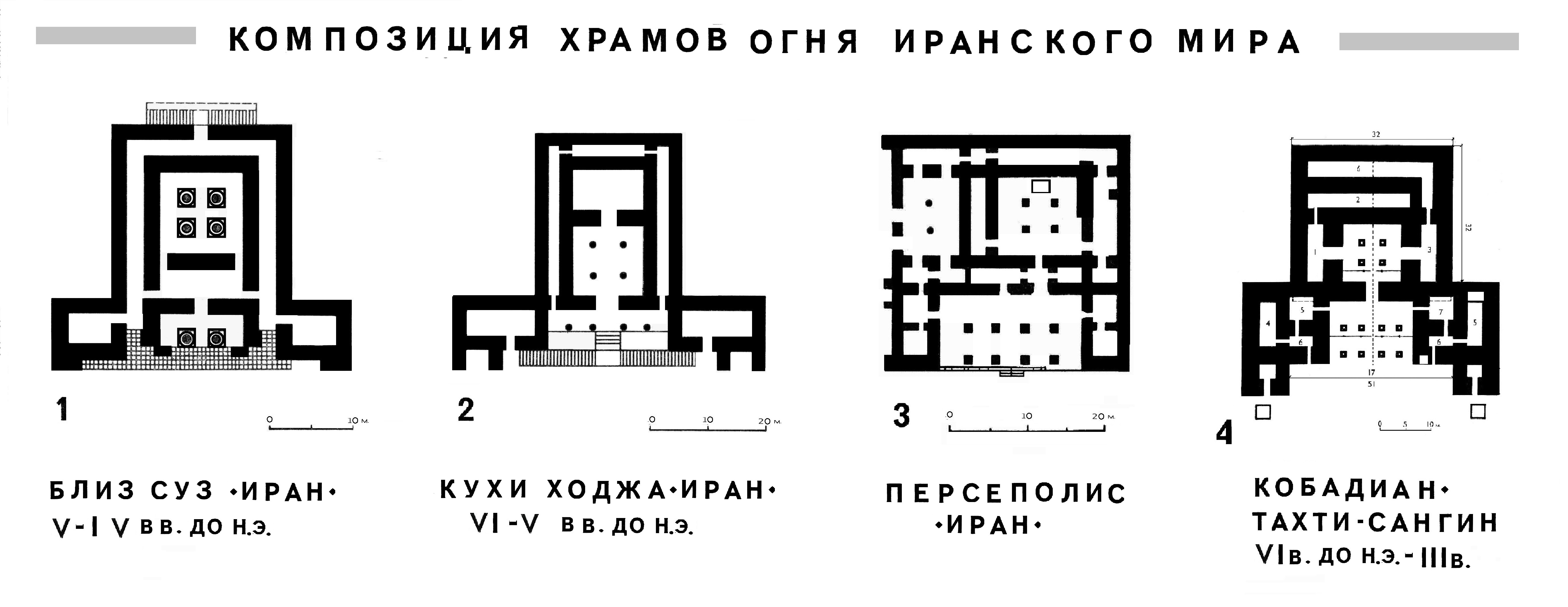 Объемно-пространственное и композиционное решение храма на основании известных образцов, раскопанных ранее в Иране позволяет отнести Тахти Сангин, как хронологически, так и типологически к древнеиранским храмам-огня VI -III вв. до н.э.: в Кухи Ходжа, Персеполисе и в Сузах.