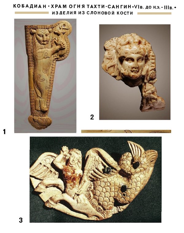 Такая бинарность вода-огонь позволяет заключить, что храм Окса был одновременно храмом водной стихии реки Окс и храмом огня. С высоким мастерством вырезана на кости композиция изображающая греческую богиню Гиппокампесу в виде женщины со змеино-рыбьим хвостом, лошадиными ногами и крыльями птицы, в бактрийской мифологии перевоплотившуюся в спутницу бога реки Окса.