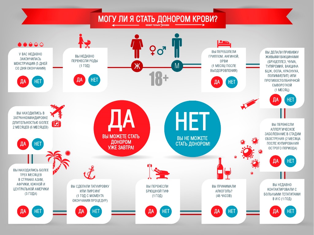 Есть и относительные противопоказания, при устранении которых можно заново сдавать кровь. К ним относят, например, анемию, потерю крови во время плановой операции, низкий уровень гемоглобина, низкий вес и т. д.