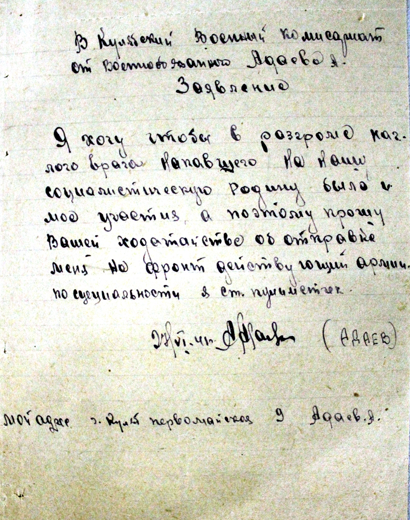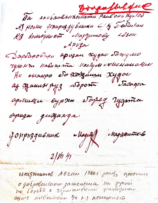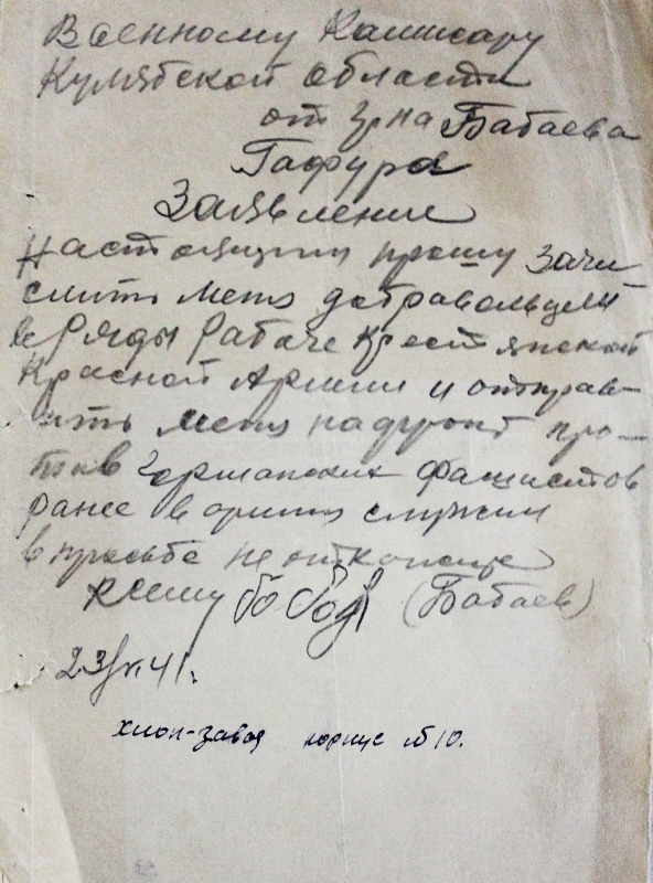 «23 июня 1941 год … Москва, ЦК ВКП (б) Таджикистана, товарищу Сталину Иосифу Виссарионовичу. Сообщаю, что в течение 23 июня в ЦК КП (б) Таджикистана и военный комиссариат только по городу Сталинабад поступило свыше 700 заявлений о добровольном зачислении в ряды Красной армии.
