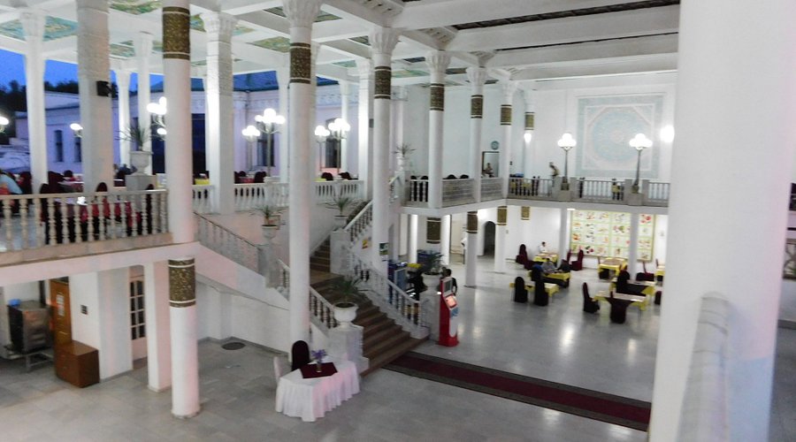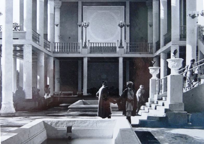 Это было двухэтажное здание, оформленное в национальном стиле, с открытыми террасами, колоннами, расписными потолками и стенами, украшенное мозаикой из цветного стекла.