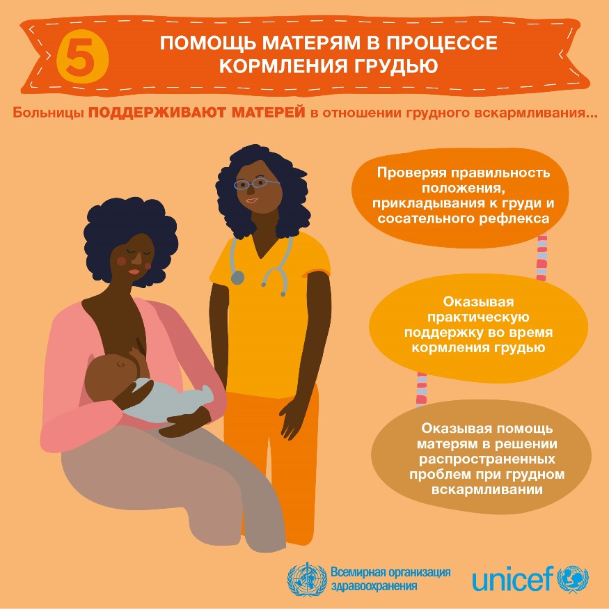 — Женщин, которые вообще не могут лактировать, на самом деле мало. Но очень много мам, у которых рядом нет должной поддержки и профессиональной помощи, зато множество тревог и страхов за малыша. Вот уже несколько лет ВОЗ и ЮНИСЕФ совместно внедряют в странах мира программу «10 шагов к успешному грудному вскармливанию». В этот список входят: