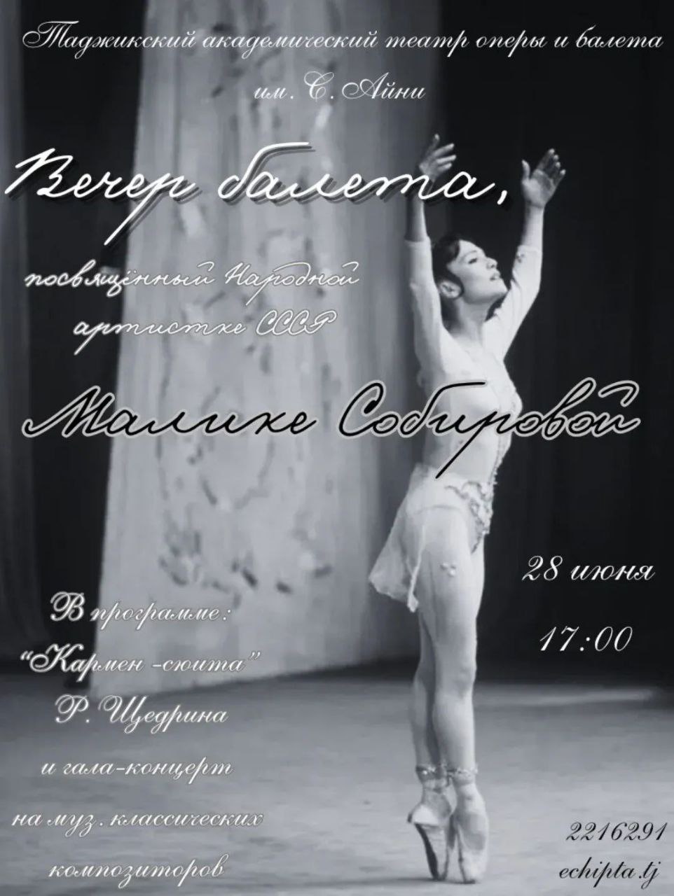 В Государственном академическом театре оперы и балета им. С. Айни 28 июня в 17:00 пройдёт «Вечер балета», посвящённый Народной артистке СССР Малике Сабировой. Этот хореографический гала-концерт станет красивой точкой в данном театральном сезоне, после которого театр отправится в летний отпуск.