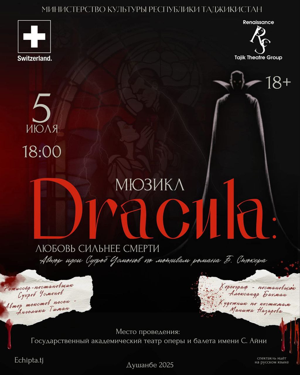 На сцене Государственного академического театра оперы и балета им. С. Айни 5 июля в 18:00 состоится грандиозная премьера мюзикла «Dracula: Любовь сильнее смерти» по мотивам бессмертного романа Брэма Стокера «Дракула».