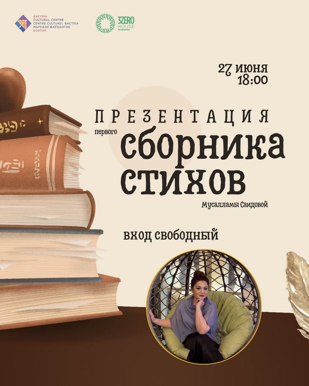 В Культурном Центре «Бактрия» 27 июня в 18:00 состоится презентация первого сборника стихов таджикской поэтессы Мусалламы Саидовой. Помимо чтения стихов в программе классическая музыка и танцы. Приходите, и проведите уютный вечер в творческой эстетической атмосфере.