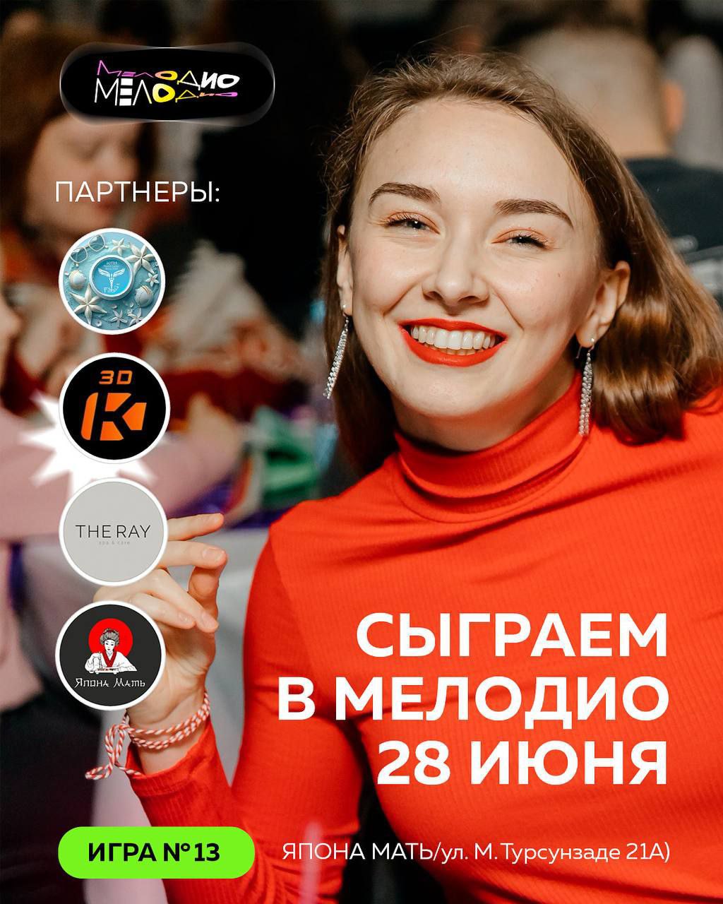 В ресторане «Япона мать» 28 июня в 18:30 пройдёт увлекательное мероприятие «Мелодио» — специально для любителей и ценителей музыки. Это смешение элементов игры, караоке, дискотеки и квиза. Участников ждут зажигательные хиты, танцы в перерывах и призы. В течение трех туров победителем может стать каждый, главное – слушать музыку и заполнять бланки правильными ответами.