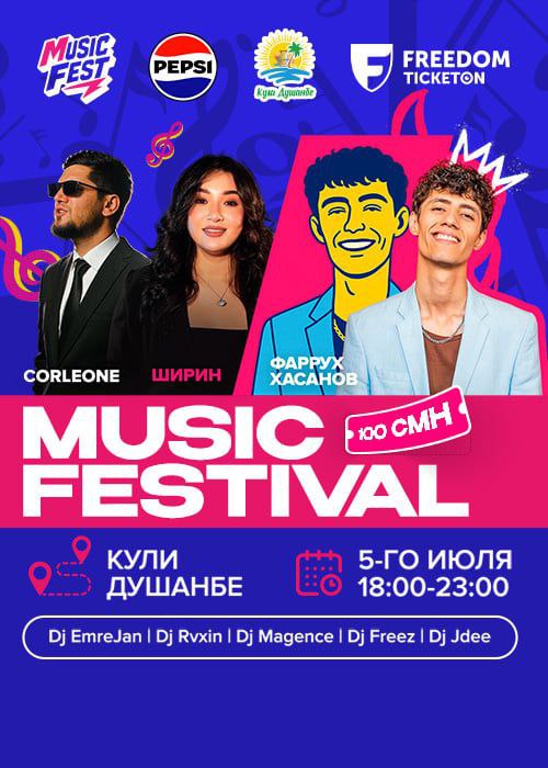 В аквапарке «Кули Душанбе» 5 июля в 17:00 пройдёт ежегодный летний Music Festival-2025. Вас ждут: диджей-сеты от Emrejan, Magence, Freez и Jdee, Rvxin. А также выступление Corleone и певицы Ширин, а хедлайнером к радости его поклонниц станет поп-звезда Фаррух Хасанов.