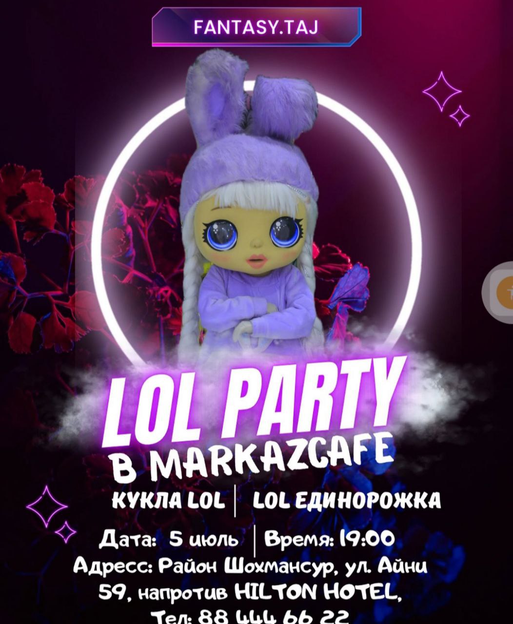 В Markaz Cafe 5 июля в 19:00 пройдёт бесплатная шоу-программа с аниматорами от ДРЦ «Фантазия», специально для девочек. В программе: весёлые игры, зажигательные танцы, увлекательные конкурсы и море позитивных эмоций! Количество мест ограничено.