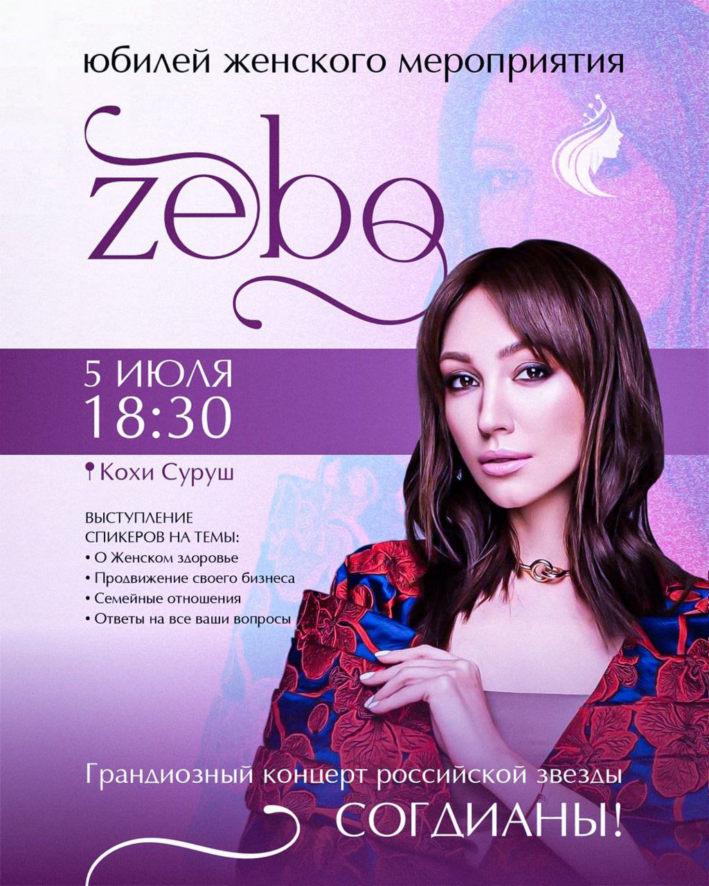 В «Кохи Суруш» 5 июля в 18:30 пройдёт яркое и вдохновляющее юбилейное событие «Зебо», посвященное женщинам и их роли в современном обществе. В программе выступления спикеров на важные и актуальные темы, такие как: женское здоровье, развитие и продвижение собственного бизнеса, семейные отношения, ответы на заданные вопросы. Гвоздь вечера — грандиозный концерт российской звезды Согдианы. Данное мероприятие это прекрасная возможность для общения, развития и просто приятного времяпровождения в кругу единомышленниц.