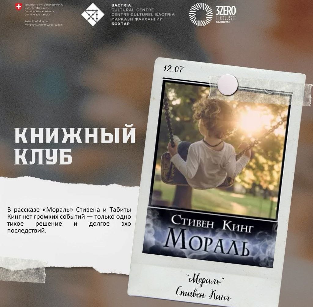 В Культурном центре «Бактрия» в пространстве 3ZERO House Tajikistan (Хонаи Сабз) 12 июля в 16:00 пройдёт очередная встреча «Читательского клуба». На этот раз состоится обсуждение рассказа «Мораль» (Morality) короля ужасов Стивена Кинга. Это увлекательная психологическая новелла, написанная в соавторстве с супругой Табитой Кинг.