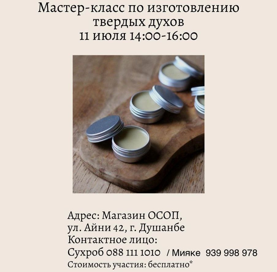 В центре JICA One Village One Product 11 июля с 14:00 до 16:00 пройдёт мастер-класс по изготовлению твёрдых духов. Приходите, чтобы научиться правильно составлять запахи и создавать собственные уникальные ароматы.