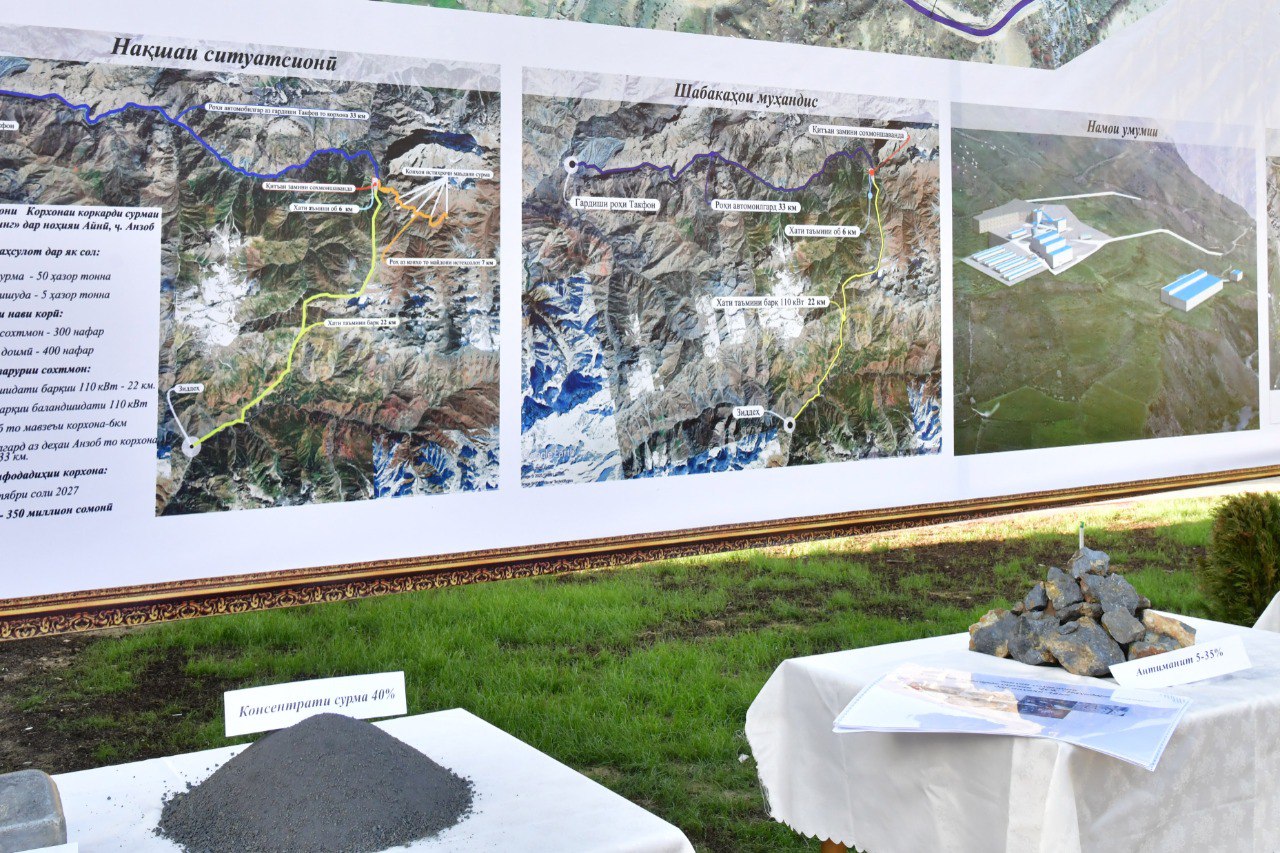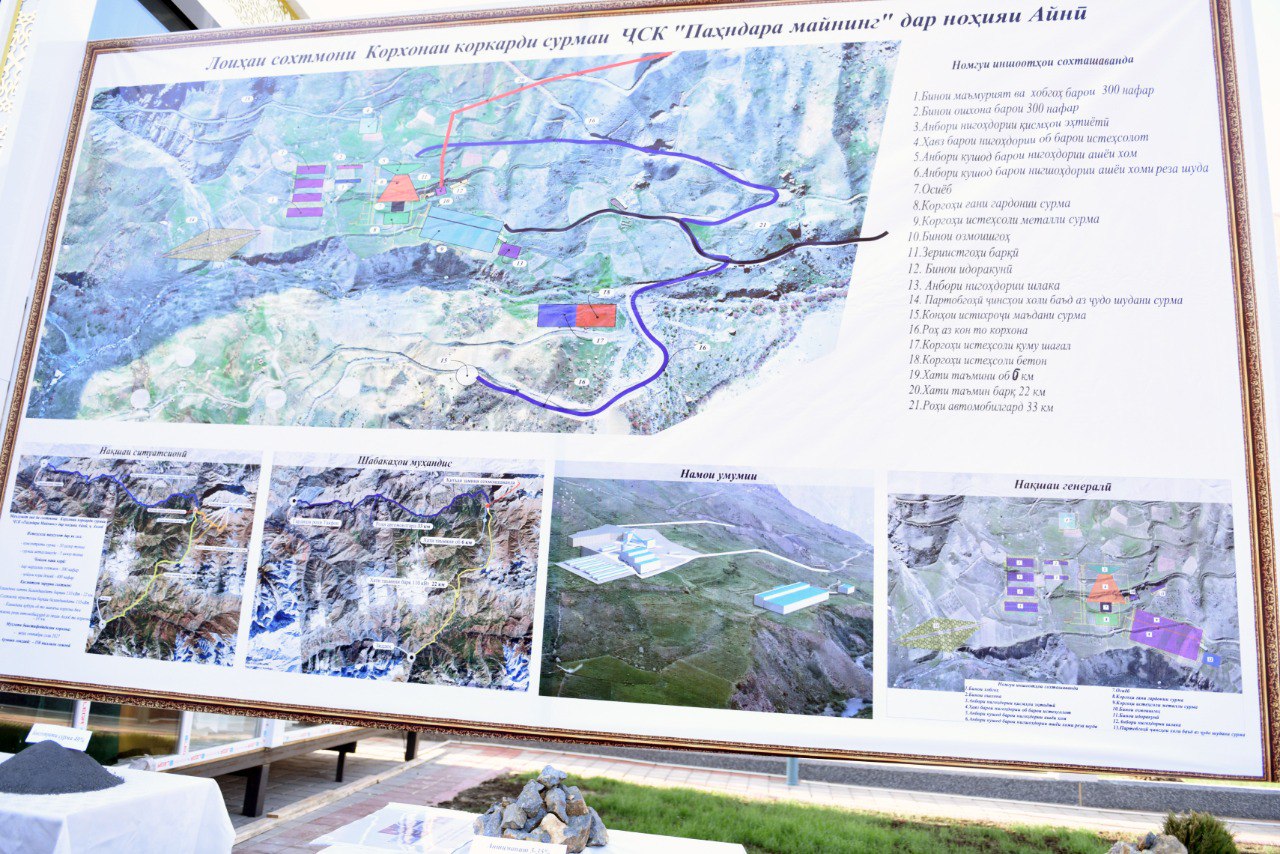 В дистанционном режиме Эмомали Рахмон запустил строительство нового горно-обогатительного предприятия – ОАО Pahndara Mining («Пахндара Майнинг») на месторождении сурьмы Пахндара. Оно расположено на высоте 3000 метров над уровнем моря.