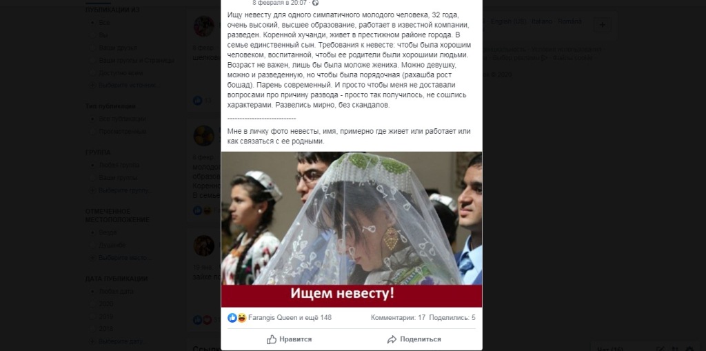 С недавних пор в Таджикистане искать невест стали искать через Facebook. Объявления в группах размещают в основном потенциальные золовки или отцы для своих сыновей и дочерей. Из критериев главный как обычно – воспитание и порядочность. Семья, из которой выходит девушка тоже важна.