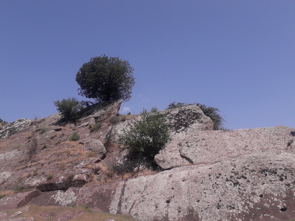 Но по пути ко второй группе следов есть стоянка позднего средневековья. Сохранился большой плоский камень, напоминающий жернов, с углублением в середине. Видимо, в нем обмолачивали зерно для муки.