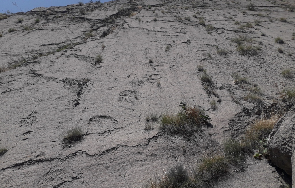 Тут выделяется три типа трехпалых следов, они различны по размерам и вероятно принадлежат нескольким видам динозавров.