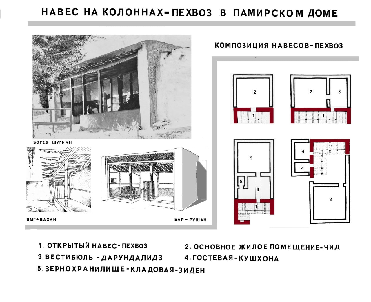 Последовательное расположение помещений в триаде эгейского мегарона (Троя, Крит, Микены, Тиринф), от открытого в одну сторону навеса с антами – наос, через проходное помещение – вестибюль – пронаос, в монументальный замкнутый зал, освещаемый через световой люк в перекрытии – мегарон, мы видим и в памирском чиде: пехвоз – дарундалидз – чид.
