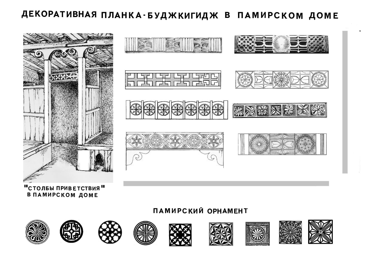 Особое внимание мастера уделяли оформлению резной планки – бучкигидж, являющегося характерной только для верхних районов Бадахшана и не имеет аналогий в жилищах Центральной Азии. Даже в самых скромных домах орнаментированный бучкигидж являлся единственным украшением интерьера чида.