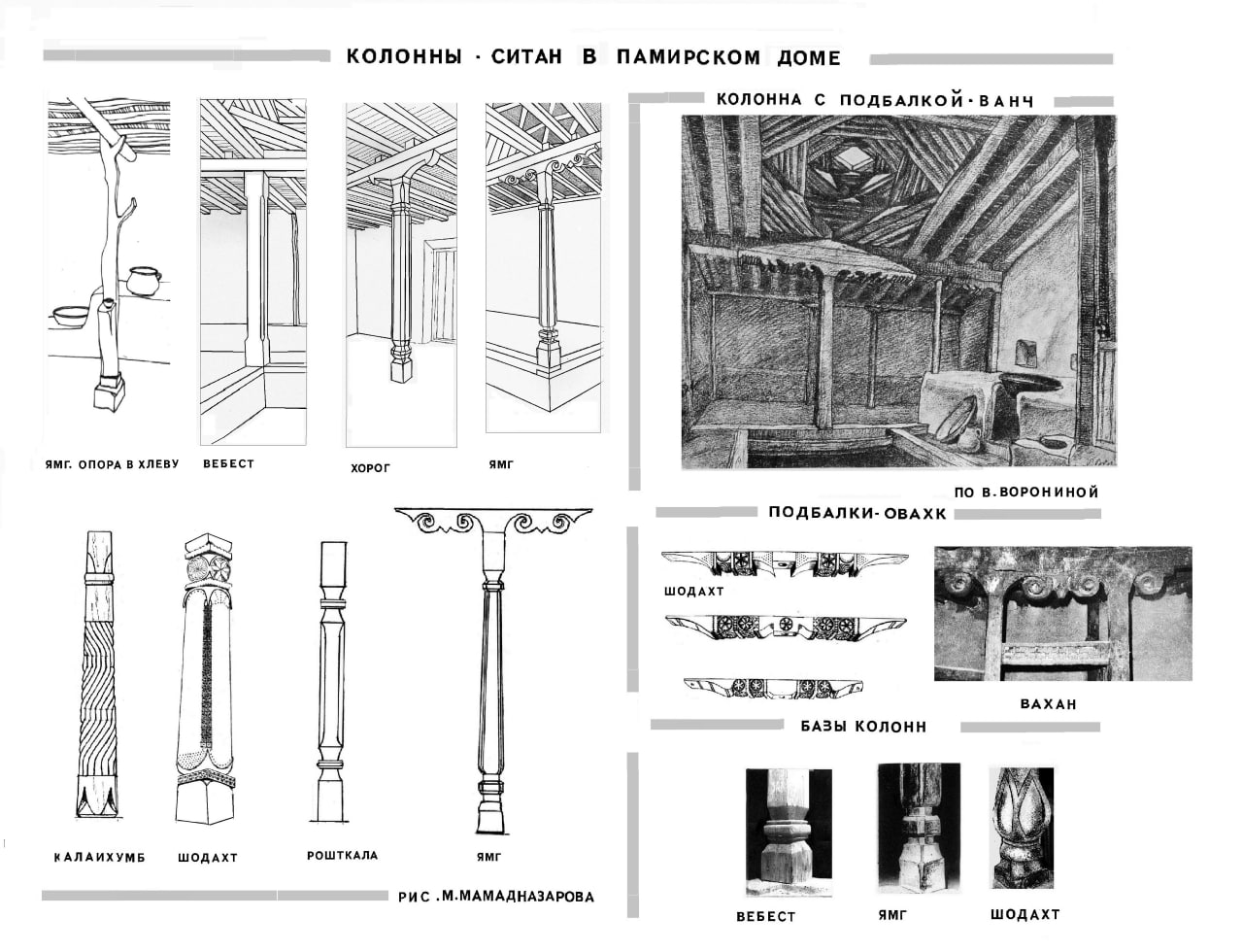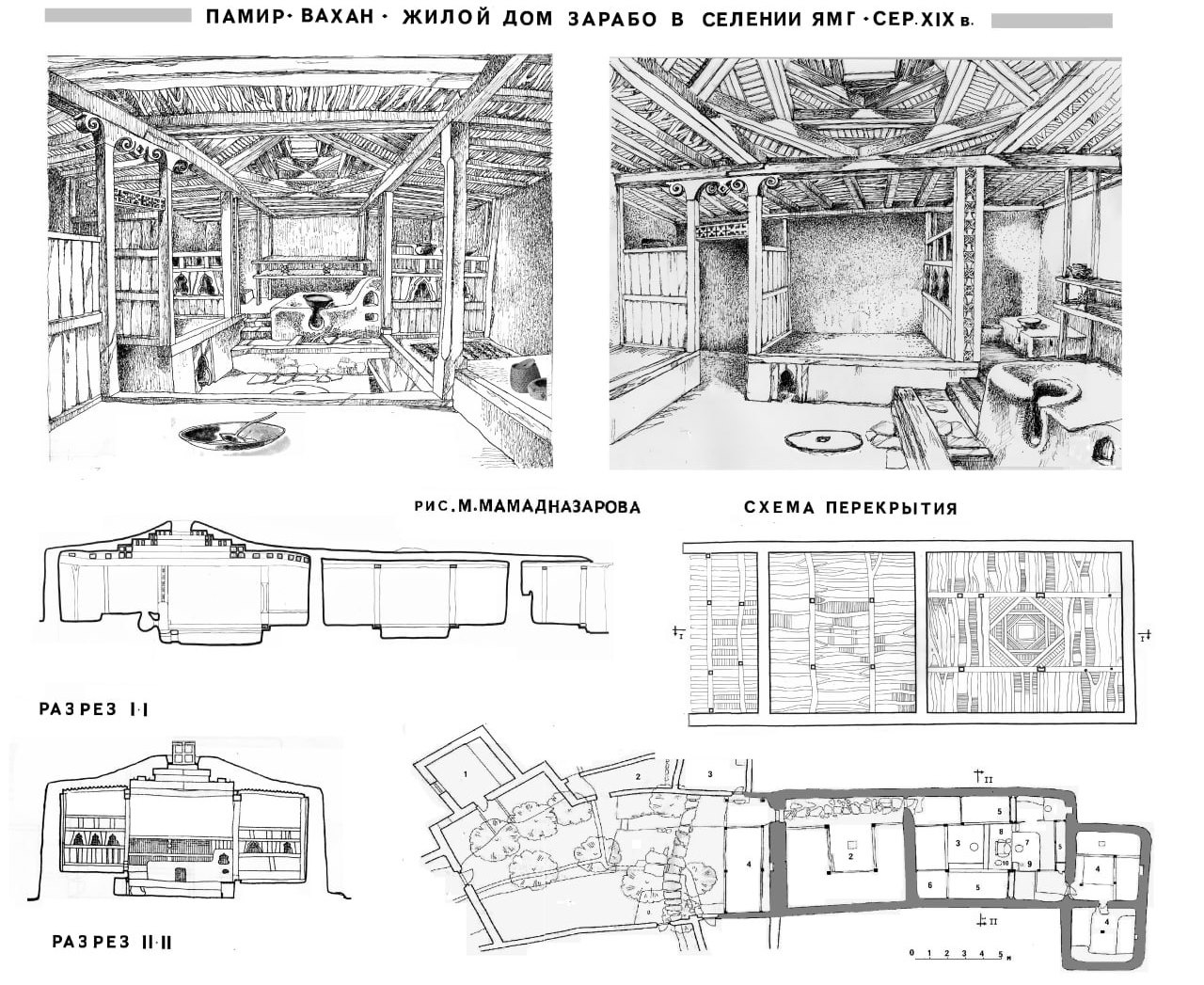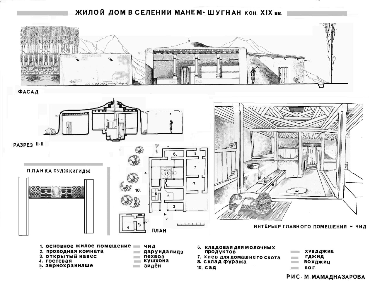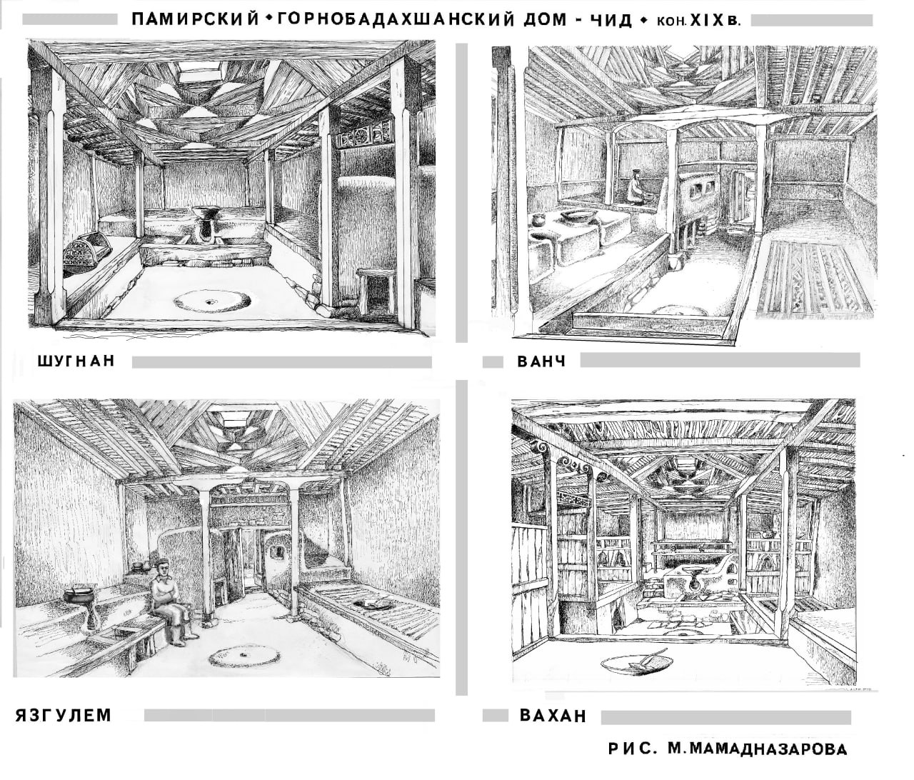 Описание ведётся изнутри сверху вниз. При этом раучана, священный элемент дома – это не окно, а именно световой люк в зените. Примечательно, что в шугнанском языке окно – ток, видимо, позднего происхождения и означает оно, в большей степени нишу в стене.