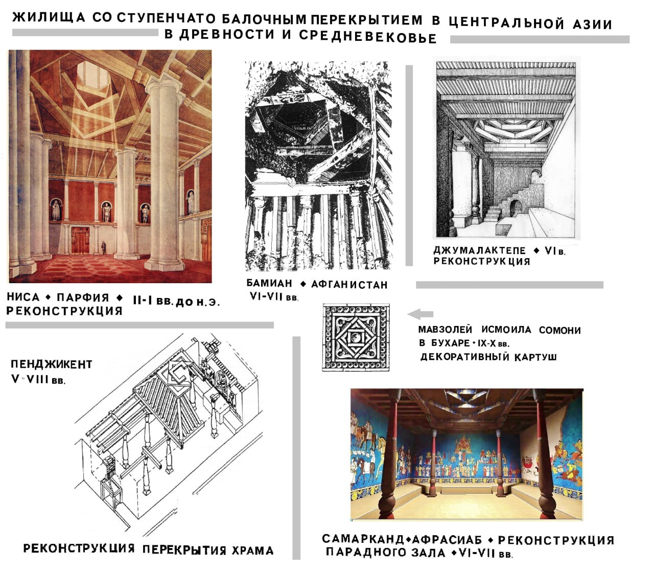Широкое распространение рассматриваемого покрытия в древней и раннесредневековой Центральной Азии подтверждают многочисленными реконструкции четырехколонных замкнутых залов Бактрии, Согда, Уструшаны, Ферганы, Парфии и Хорезма.