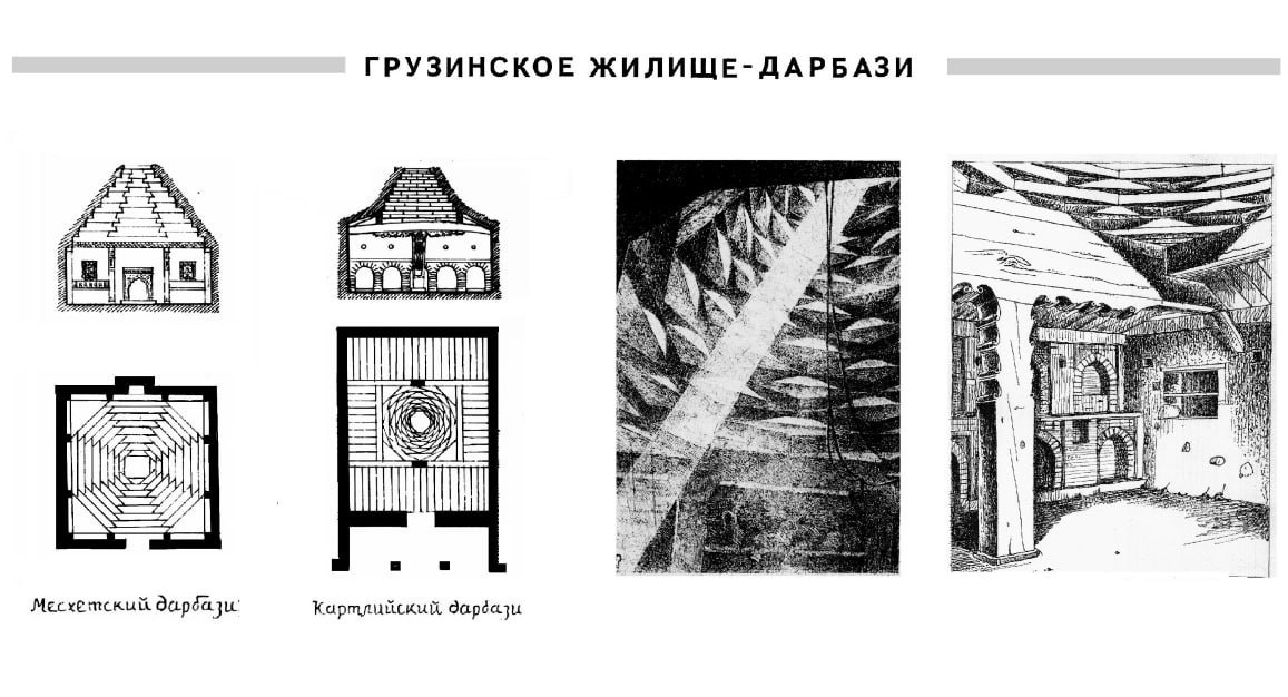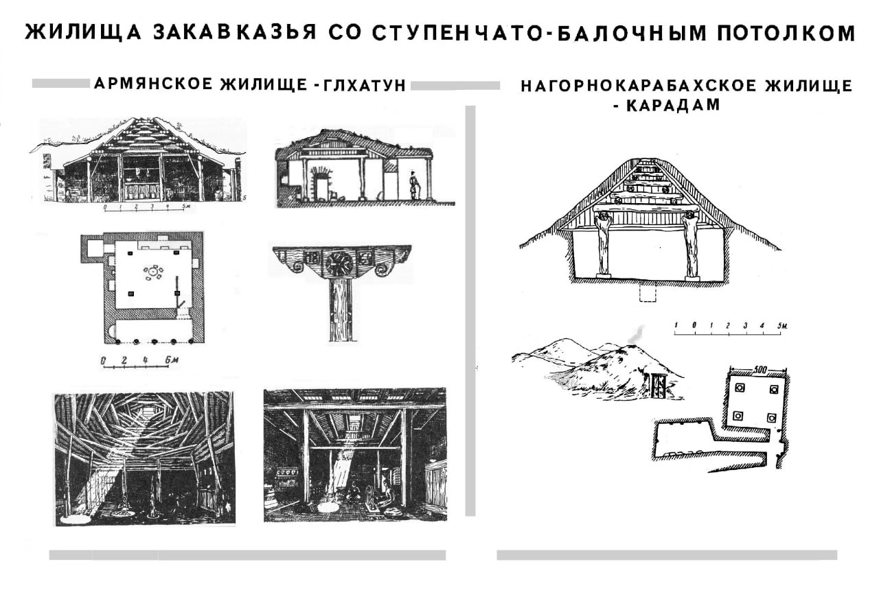 Иранские термины встречаются и в деталях ступенчатых жилищах Закавказья – дарбази (дарвоза-ворота), хазарашенк (тысячестрой от хазор-тысяча) тондир – (очаг, танур) и, возможно, само название армянского жилища глхатун (гл, гил – глина) глиняный дом.